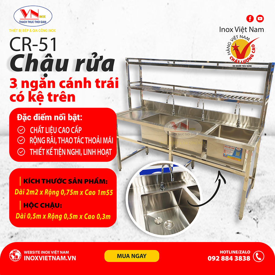 Chậu Rửa Inox 3 Hộc Cánh Trái Có Kệ Trên CR-51