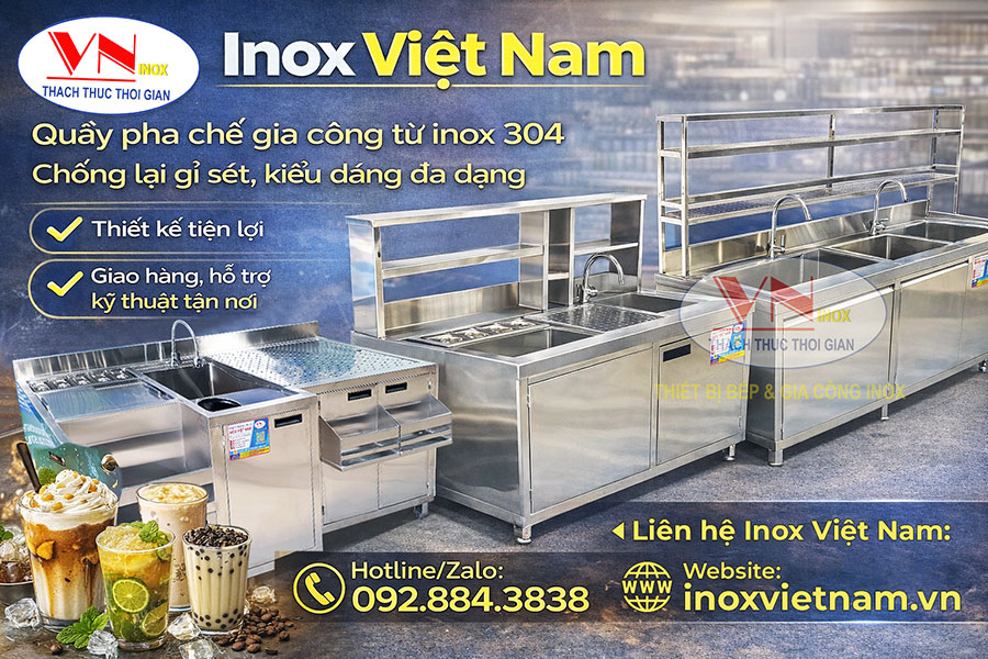 Bếp Inox Việt Nam Là nhà sản xuất được trang bị hệ thống máy móc hiện đại. Cùng với đội ngũ thiết kế có kinh nghiệm nhiều năm trong lĩnh vực sản xuất thiết bị inox: Quầy pha chế inox, quầy pha chế trà sữa, quầy pha chế cafe, quầy bar inox, thùng đá inox. Chúng tôi tự hào cung cấp ra thị trường các sản phẩm dịch vụ với các khâu: Tư vấn - Thiết kế - Sản xuất - Bảo hành thiết bị cho quầy pha chế cafe trà sữa. Quý khách hàng đang có nhu cầu lắp đặt quầy pha chế trà sữa inox, quầy bar inox. Hãy đến với chúng tôi để được sử dụng thiết bị với chất lượng tốt nhất.